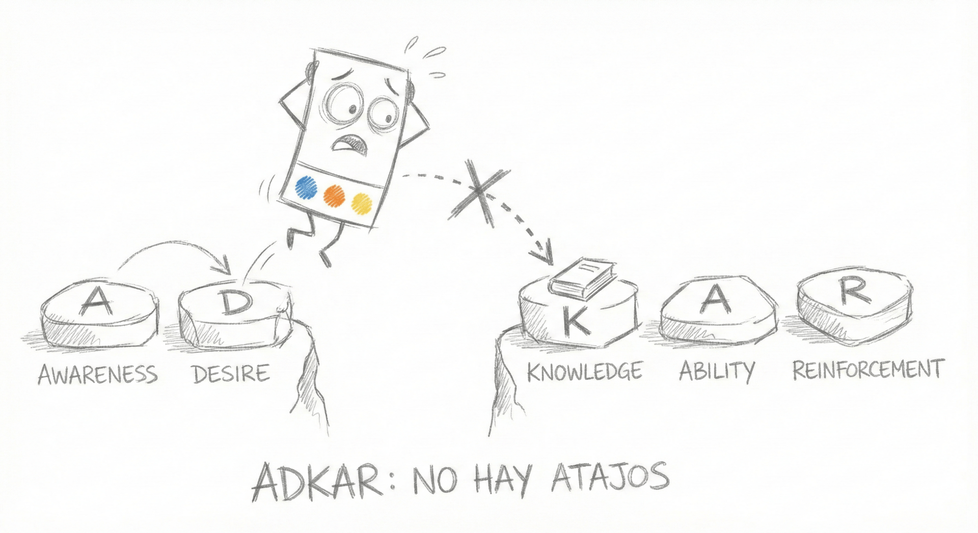La razón es simple: ADKAR entiende la adopción como un proceso psicológico secuencial, no como un evento técnico puntual.